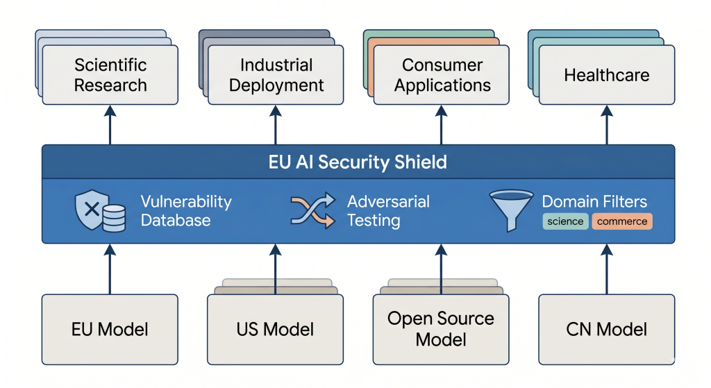 • An EU AI Security Commons — publicly funded security shield models that sit in front of any base model, regardless of origin. When a new vulnerability is discovered, the shield is updated once and every European deployment behind it is protected. European model, American model, Chinese model: same protection layer.