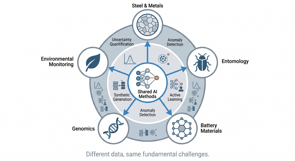 Our own work spans from materials to life sciences, ranging from steel, to batteries to detecting viruses or counting insects. These domains look nothing alike until you realise the AI challenges are nearly identical: scarce labelled data, complex multi-modal measurements, and a fundamental need to know when the model is out of its depth.