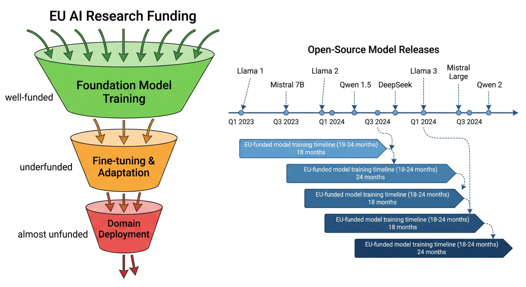 Here’s a pattern we’ve seen repeatedly in Horizon Europe project evaluations: a consortium proposes to train a new model from scratch. The reviewers approve it. Eighteen months later, the model is finished — and already outperformed by three open-source releases that appeared in the interim. The compute, the energy, the researcher-years: all spent re-deriving capabilities that were freely available.