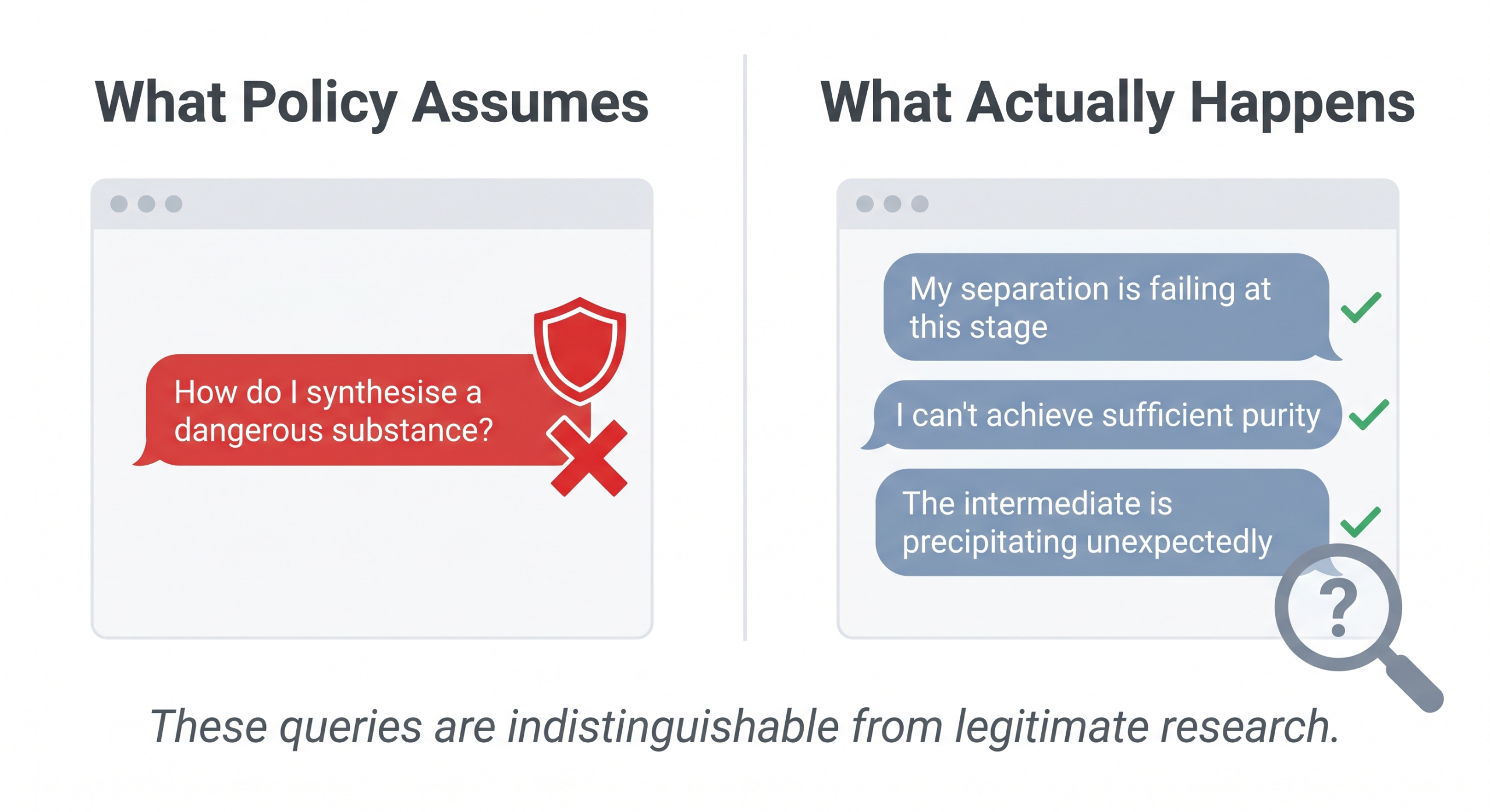 These are indistinguishable from the questions a PhD student asks their supervisor every week. You cannot filter them without crippling legitimate research. And any actor far enough along to ask these engineering troubleshooting questions already possesses the domain knowledge to answer them independently – the practical bottlenecks in dangerous synthesis are often materials, equipment, and infrastructure, rather than information. Moreover, removing dangerous knowledge from a model creates its own risk: a model that no longer understands what makes a substance dangerous cannot recognise when it’s being guided through a dangerous synthesis. The request looks like organic chemistry homework – because to the model, it now is.